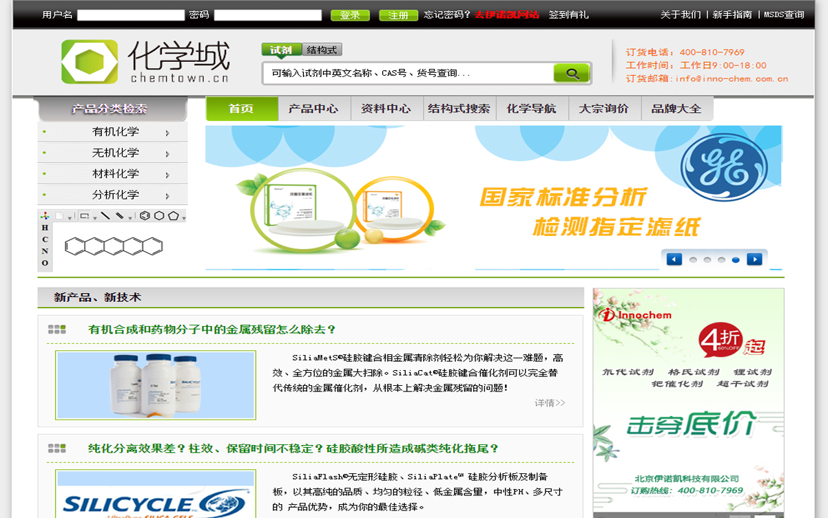 城市,人类走向文明和成熟的标志,社会资源的聚集地,科学文化的传承地,社会发展的腾飞地;互联网,信息的海洋,交流的平台;化学城,由北京伊诺凯科技有限公司建立的一座化学信息的网络城市,一个化学领域信息的交流平台,这里聚集了包含有机化学、无机化学、材料化学和分析化学领域近800万种有效产品,700多个品牌,300多家供应商,随着不断的发展与完善,我们会逐步将生命科学、仪器耗材等各个相关行业的信息整合进来,形成完整、全面的产品线。实时的现货查询,独特多样化的搜索模式(cas号、中英文品名、结构式、品牌及货号搜索),为您提供一站式、便捷式的购物体验。